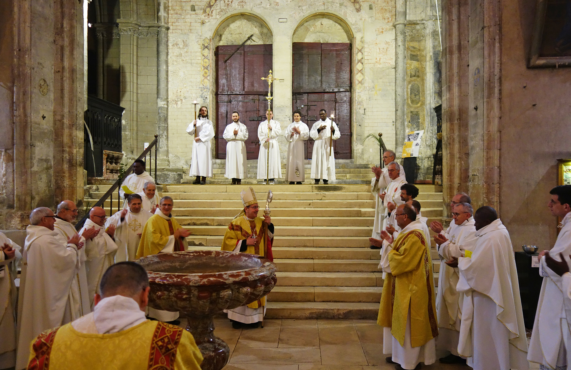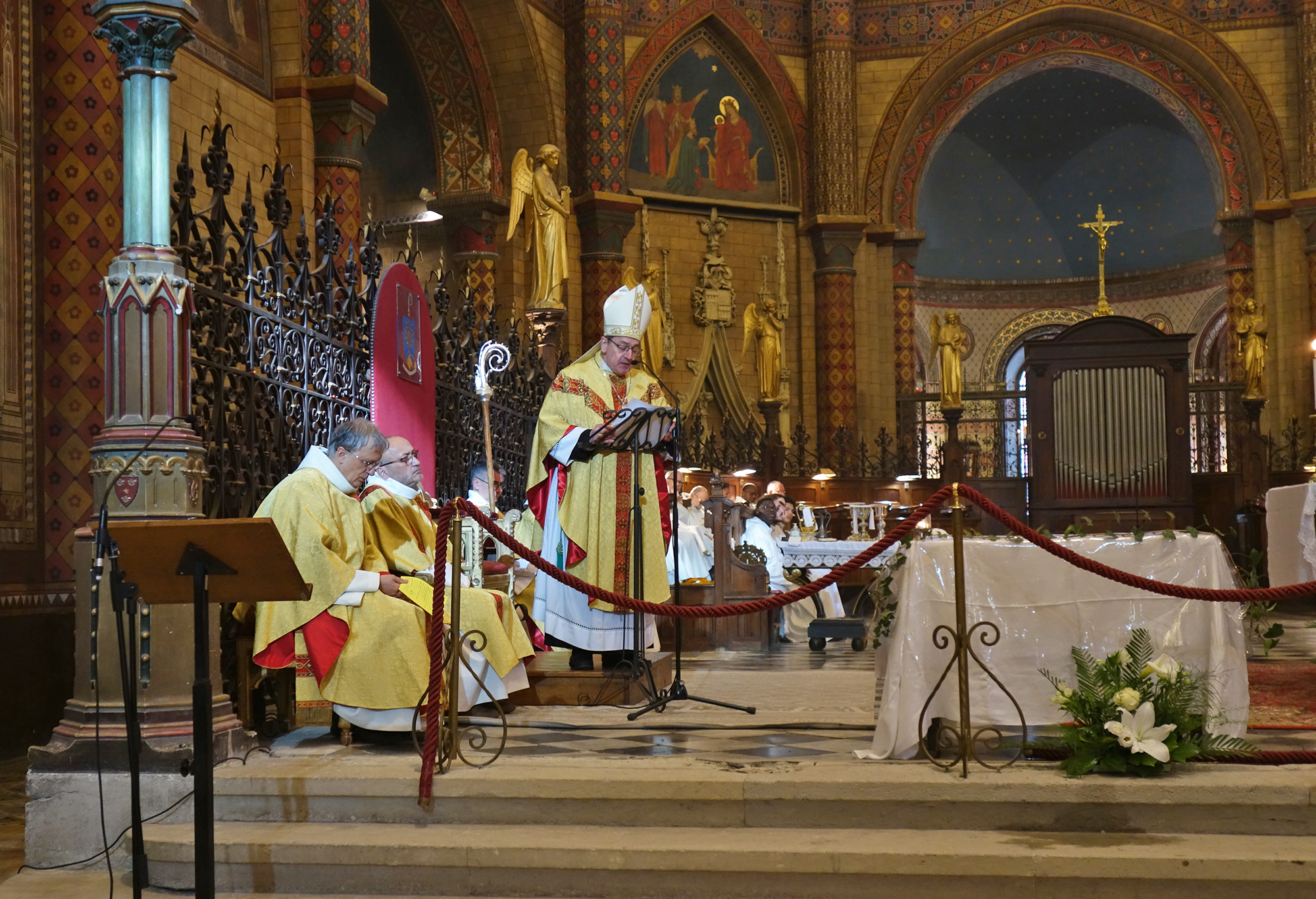 Béni soit Dieu car le Christ remplit l’Église de l’Esprit-Saint avec la merveilleuse abondance de ses dons et achève ainsi dans le monde l’œuvre du salut. Avec nos diacres qui servent les plus pauvres et facilitent les liens dans l’Église, avec les animateurs de chant réunis spécialement aujourd’hui, louons et célébrons le Seigneur dans l’action de grâce pour le Don généreux de son Esprit qui jaillit pour nous du cœur de Jésus et porte la Bonne Nouvelle aux pauvres, annonce aux captifs leur libération, aux aveugles le retour à la vue, aux opprimés la liberté. C’est aujourd’hui que cette parole s’accomplit.