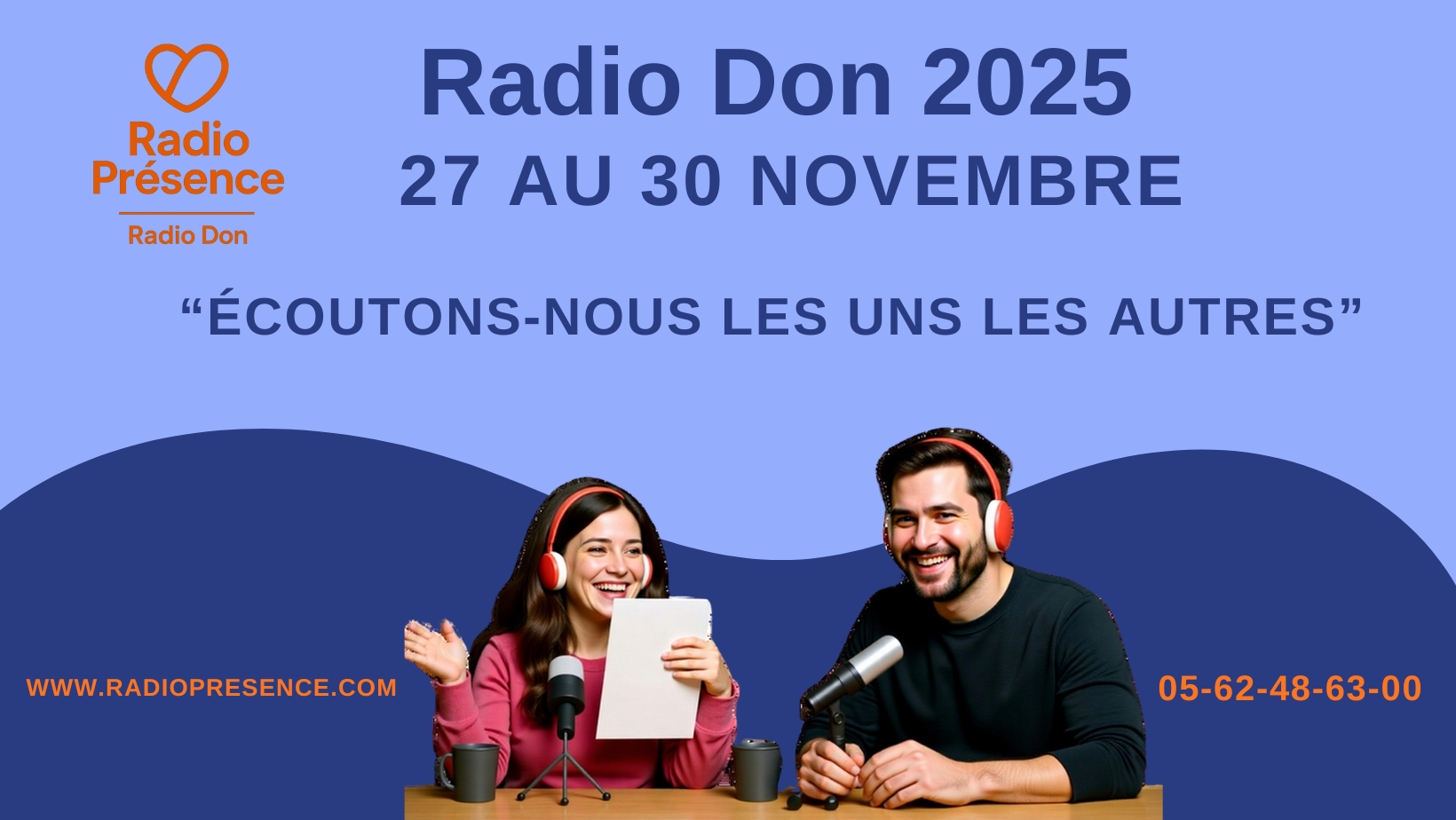 Du 27 au 30 novembre 2025, Radio Présence vivra son rendez-vous de la générosité. Le Radio Don, c’est 4 jours, de mobilisation, d’échanges et de fraternité autour du thème “Écoutons-nous les uns les autres.”